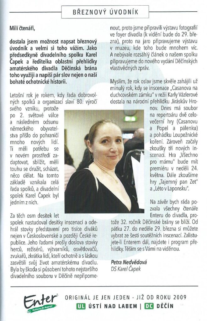 Březnový úvodník do kulturního měsíčníku Enter DC – o 80. výročí našeho souboru a o Děčínské bráně – obstarala naše předsedkyně Petra Nedvědová ⤵️