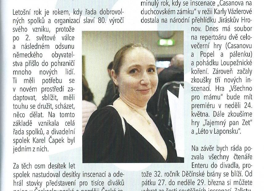 Březnový úvodník do kulturního měsíčníku Enter DC – o 80. výročí našeho souboru a o Děčínské bráně – obstarala naše předsedkyně Petra Nedvědová ⤵️